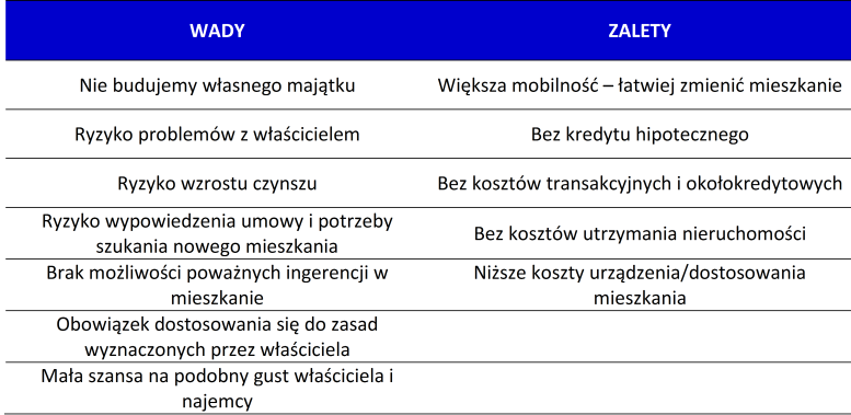 Trzeba jednak pamiętać, że najem ma też całkiem sporo wad. Wśród tych najczęściej podnoszonych jest fakt, że zamiast budować własny majątek, pozwalamy go gromadzić właścicielowi mieszkania. Po 30 latach wynajmowania mieszkania niczego nie będziemy mieli, po spłacie kredytu hipotecznego mamy zaś akt własności mieszkania, które można np. sprzedać.